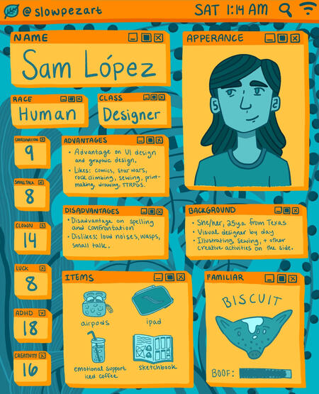 Hi! I'm Sam (she/they), a designer, illustrator, sewist, & all-around creative! ✧